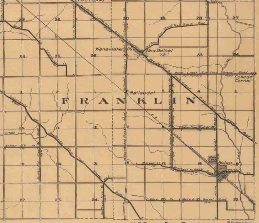 This fragment of a 1905 map of Franklin Township, found online by one of our members, gives an indication of the decades-long transition from “New Bethel” to “Wanamaker” (as described in a previous post) in that it labels the town as New Bethel, but the post office as Wanamaker. (When New Bethel had tried to obtain a post office they were told that there was already a Bethel, Indiana, so the post office was named after Postmaster General John Wanamaker. Locals continued calling the town by its original name long after the official change.)